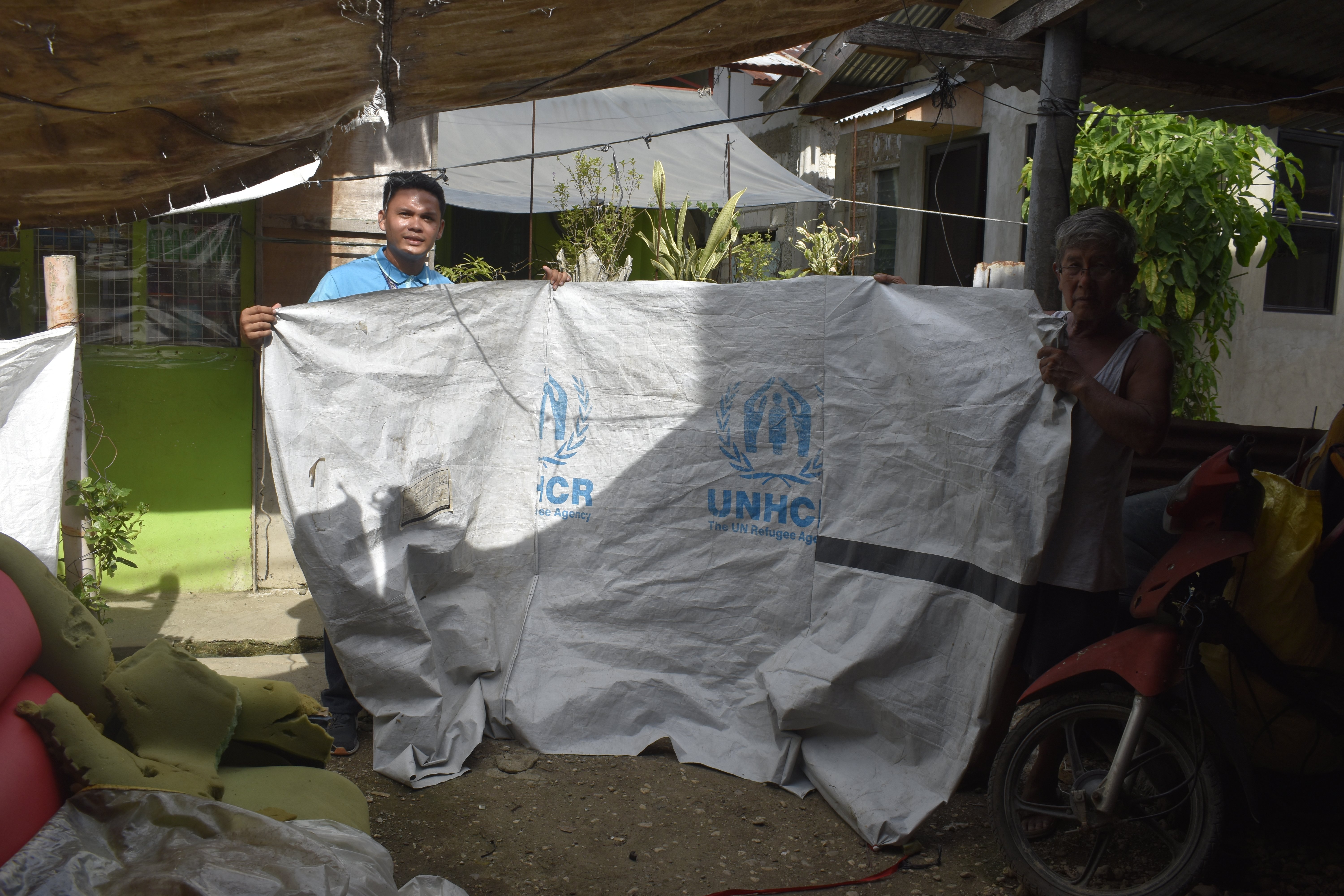 Kuya Francisco’s son helped to collect the waste tarpaulin packaging and gave it to Kuya Francisco to sew. They made one large sheet, which he passed on to other communities in need.