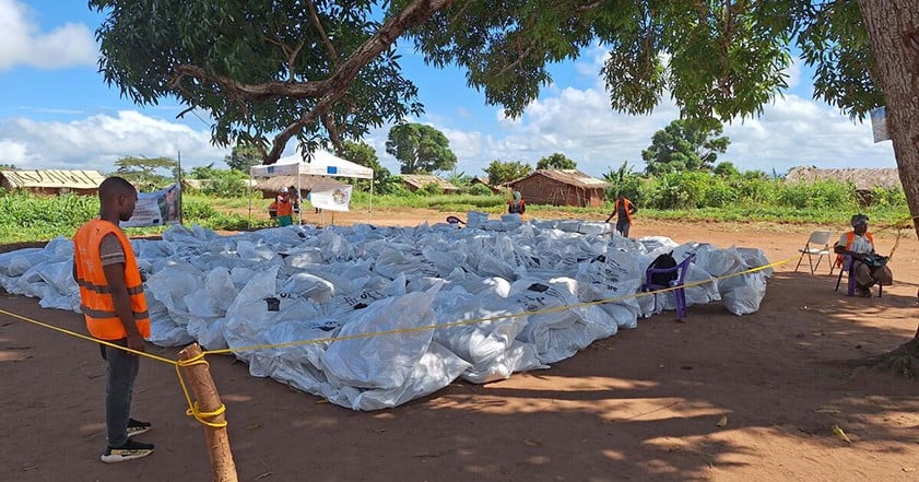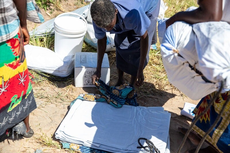 As part of this we want to reduce the amount of waste from our aid materials. But aid items like tarpaulins need to be wrapped during shipping to protect them. In Mozambique, our partner CARE Mozambique has been giving aid packaging a new life.