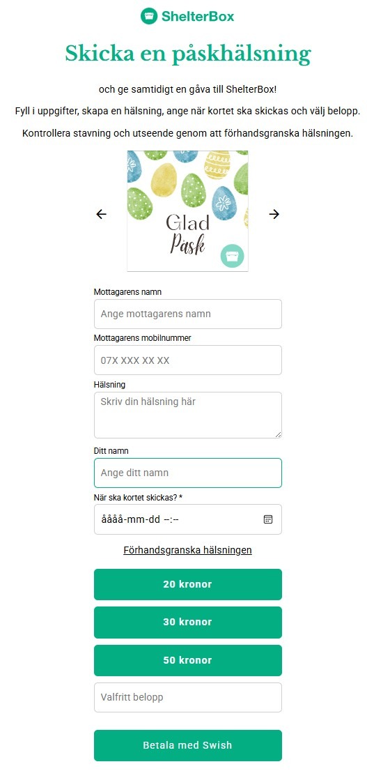 När du klickar på knappen “Betala med Swish” öppnas Swish-appen. Efter godkänd betalning skickas hälsningen iväg.
