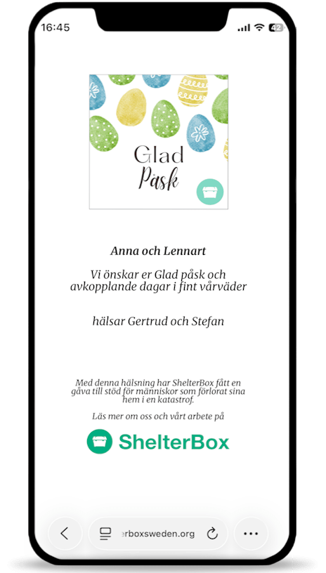 Skicka en påskhälsning till någon du tycker om samtidigt som du hjälper människor i nöd. Skicka ett digitalt påskkort som också ger värme, trygghet och hopp till människor som förlorat sitt hem i katastrofer.