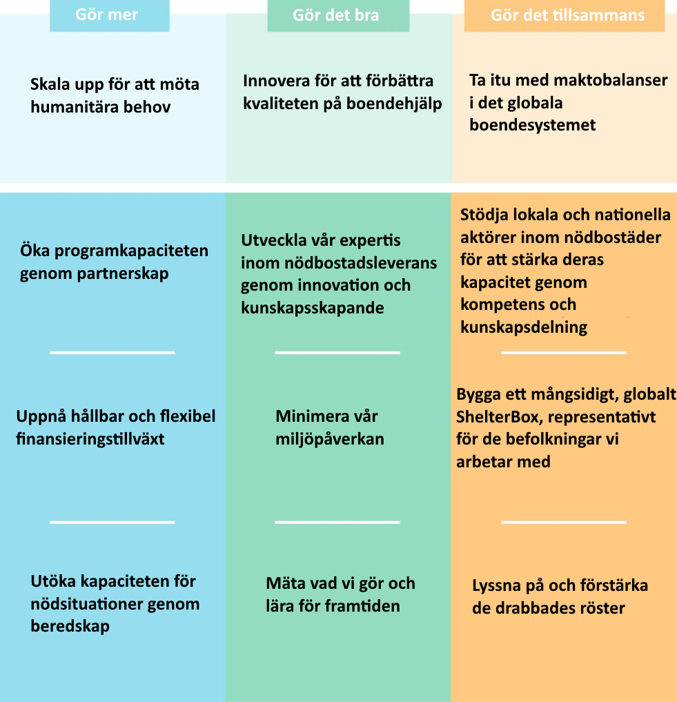 ShelterBox finns till för att förbättra människors liv. Vi är fast beslutna att göra vårt allra bästa för de som drabbats av katastrofer eller konflikter, så att vi kan göra största möjliga skillnad.