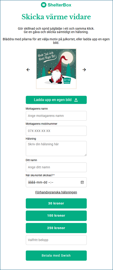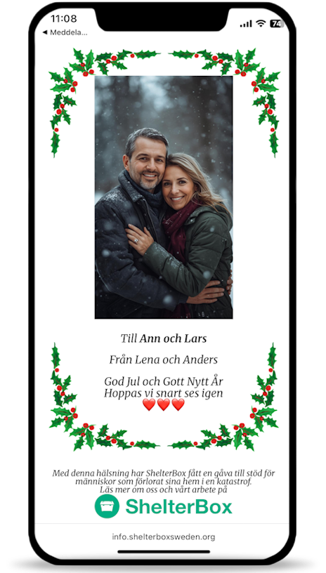 Sprid värme, trygghet och hopp till någon du tycker om samtidigt som du hjälper människor i nöd. Skicka en digital julhälsning eller ge en alternativ julklapp som också ger värme, trygghet och hopp till människor som förlorat sitt hem i katastrofer.